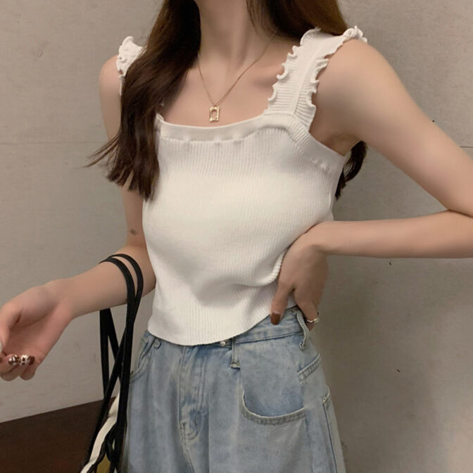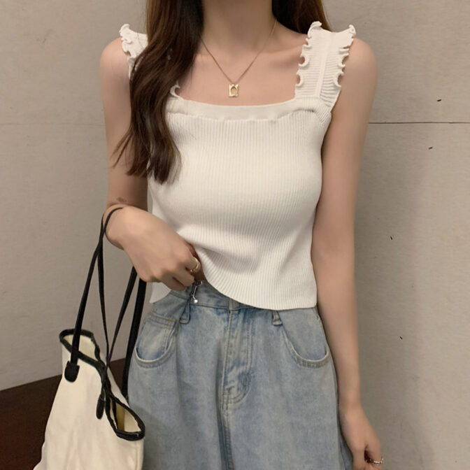 涼しくて着回ししやすいスクエアネックリブニットタンクトップ.。