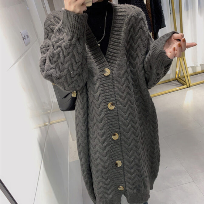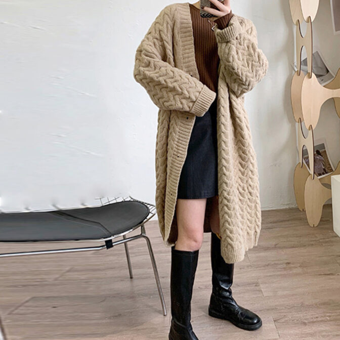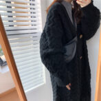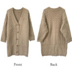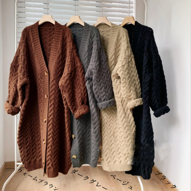 ワードローブに欠かせない立体的な大柄のケーブル編みロングニットカーディガン。
