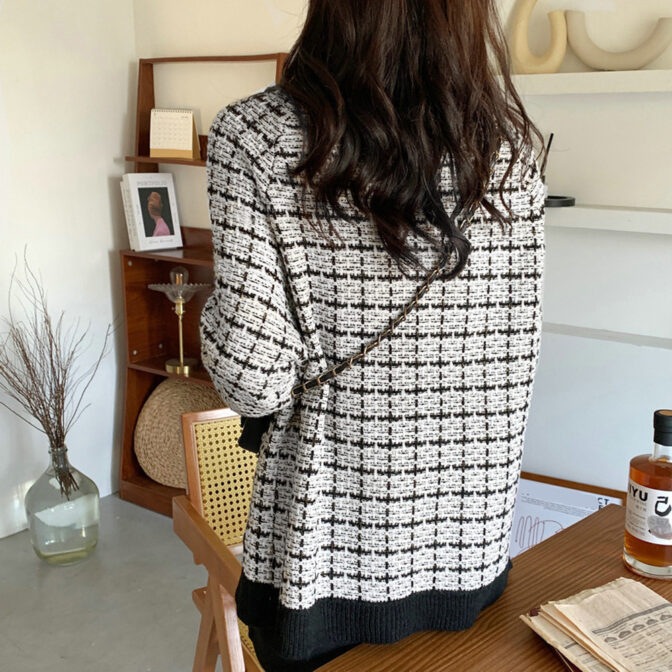 この旬にぴったりクラシカルな印象のツイード風ニットカーディガン。