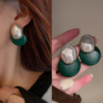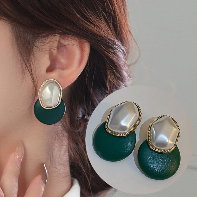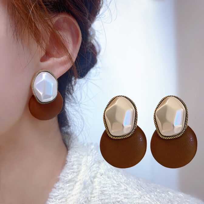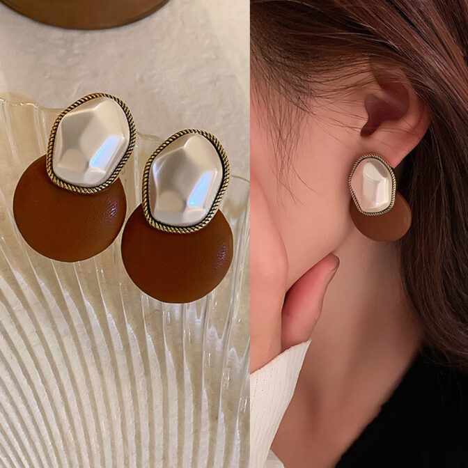 ダイヤカット半円パールに合皮の異素材で仕上げたエキゾチック系オシャレピアス。