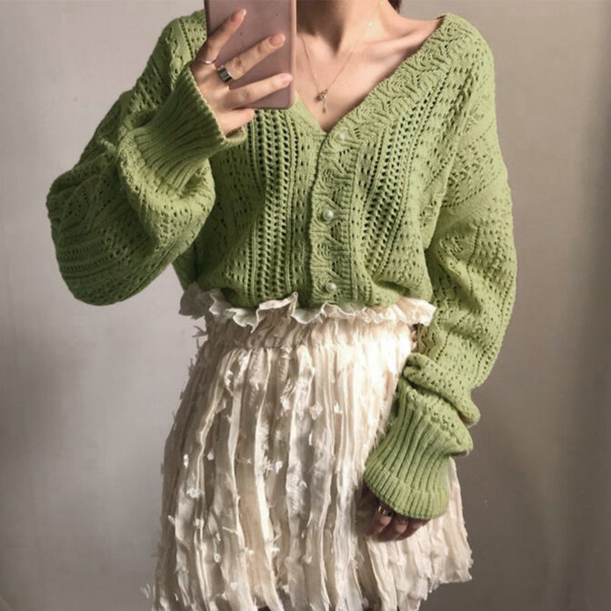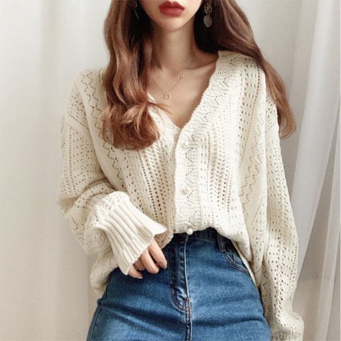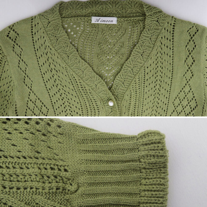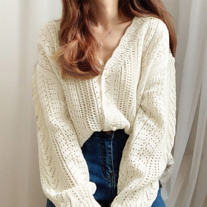 可愛い透かし編みVネック長袖レースニットカーディガンです。