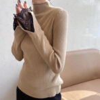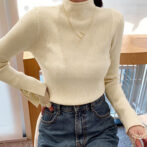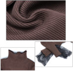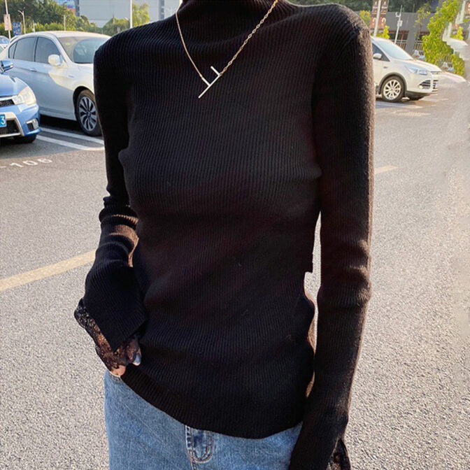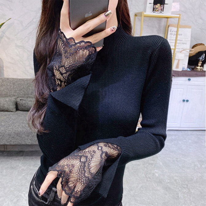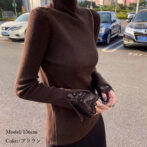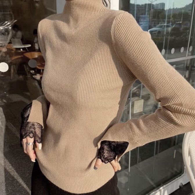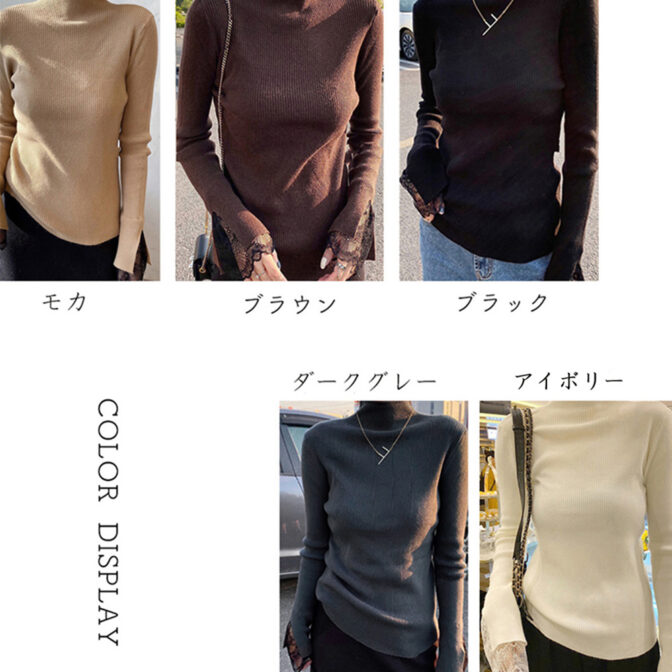 リブ編みでシャープな体のラインを演出、袖先はレース付きで可愛い印象に。