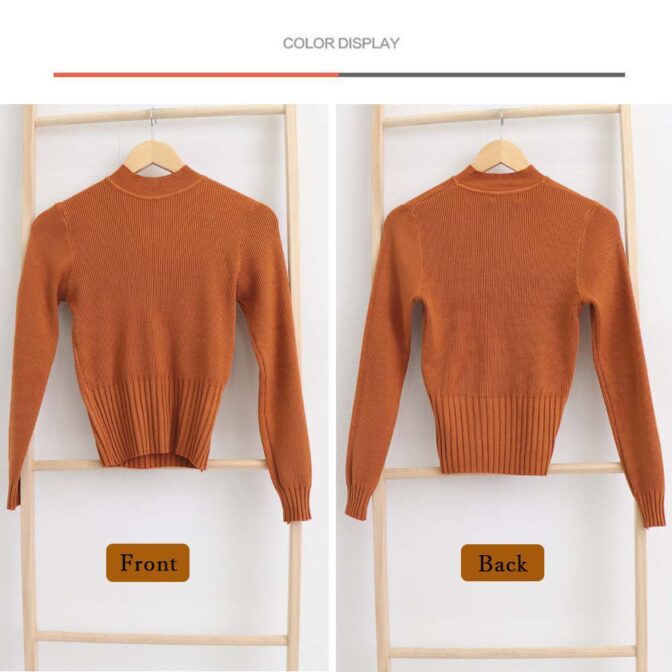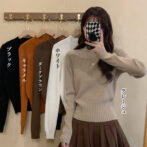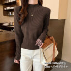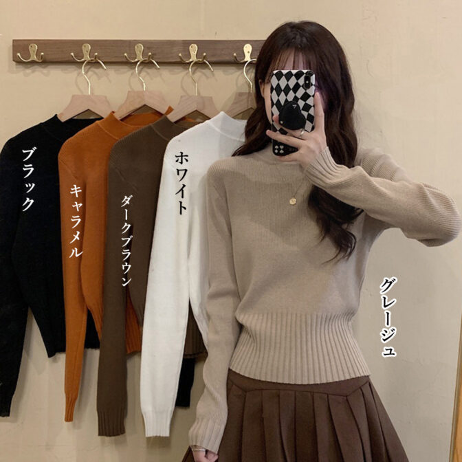 首元はきゅっと詰まったプチハイネックニットトップス。