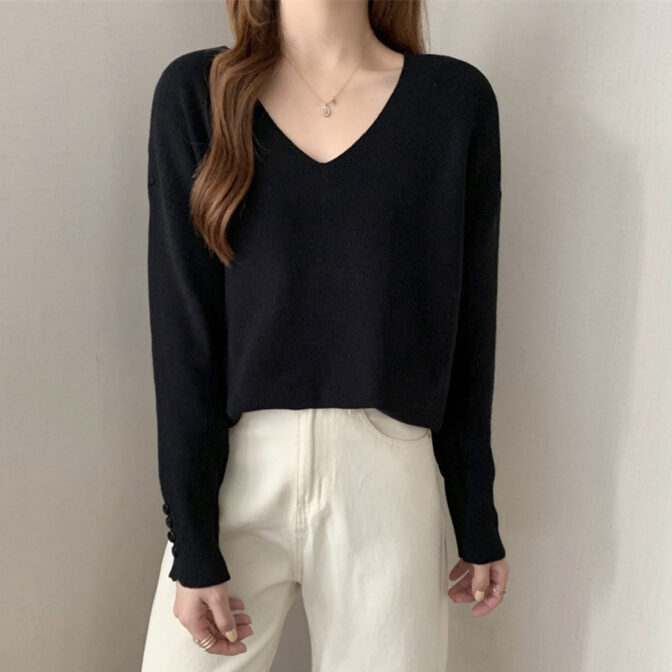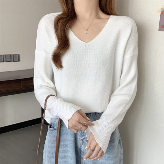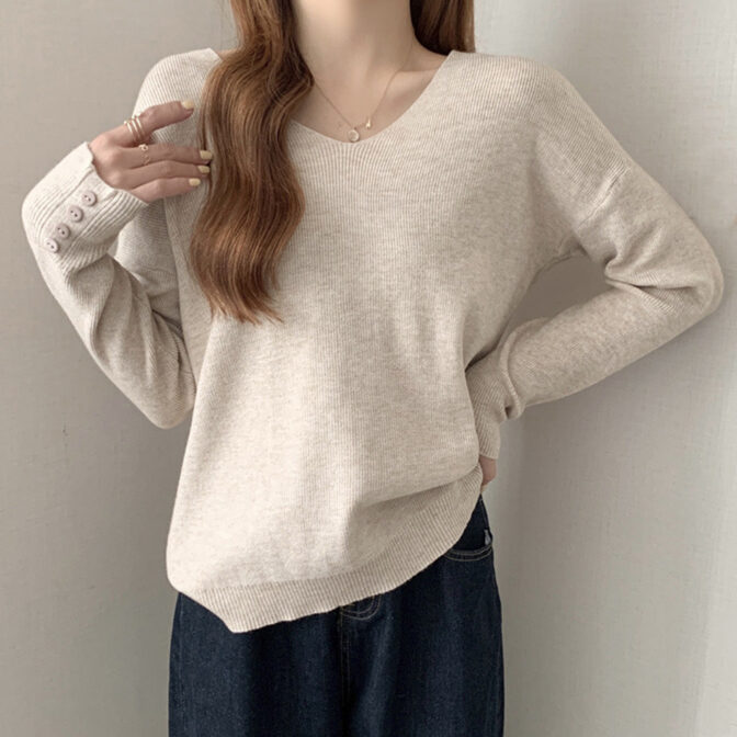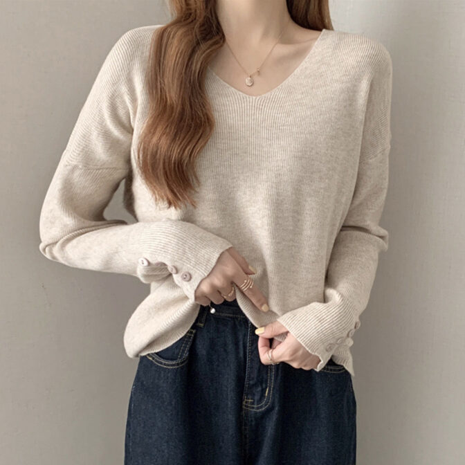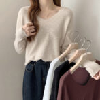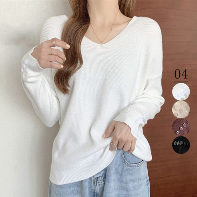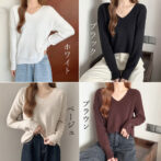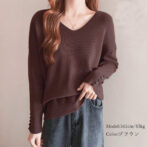 Vネックで首元が綺麗に見え、細リブがエレガントな印象のニットトップス。