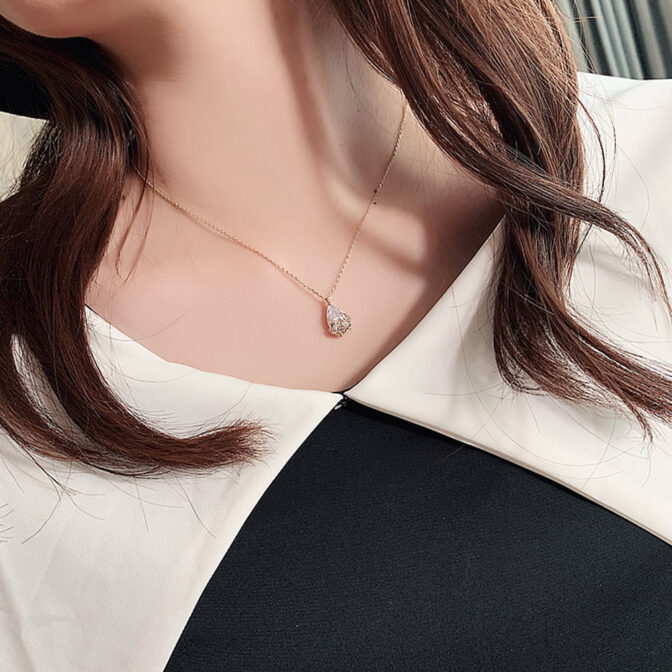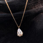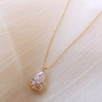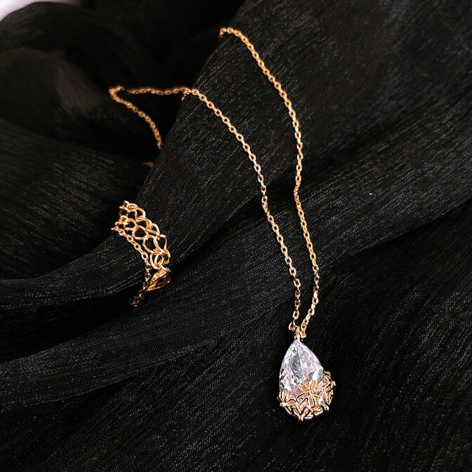 大きな一粒しずく型ビジューを花モチーフの透かし合金で包むシンプルなネックレス。