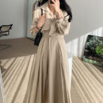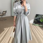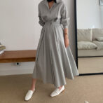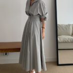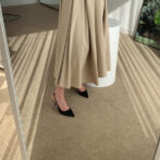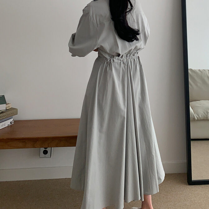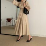 Aラインのロングスカートがふんわりと女性らしさをアップさせます。