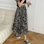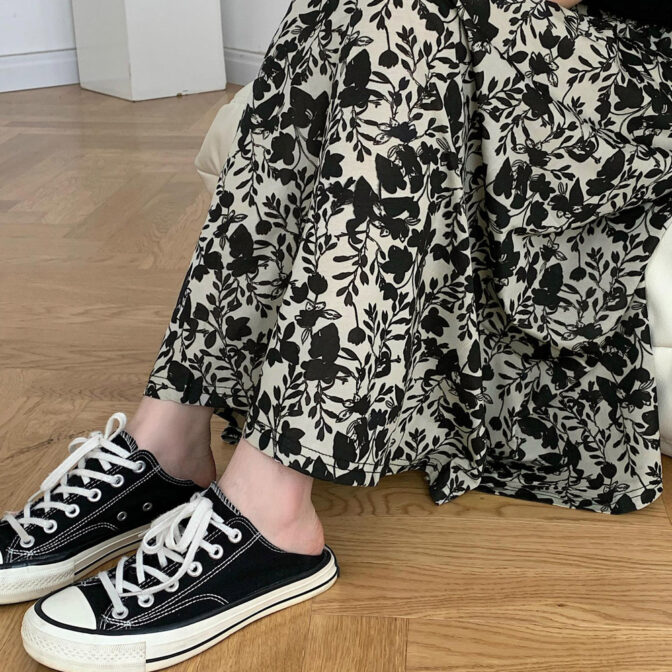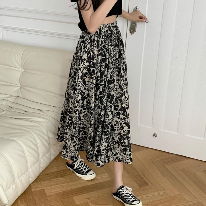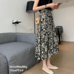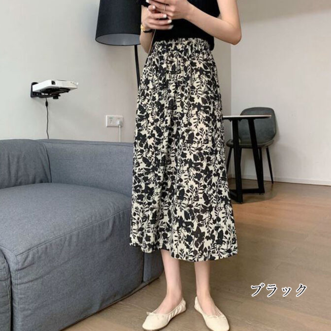 モノトーンベースで落ち着いた色合いの花柄スカートはシックな大人可愛さを演出してくれるロングスカート。