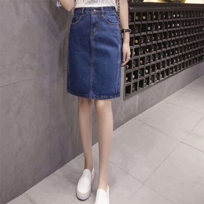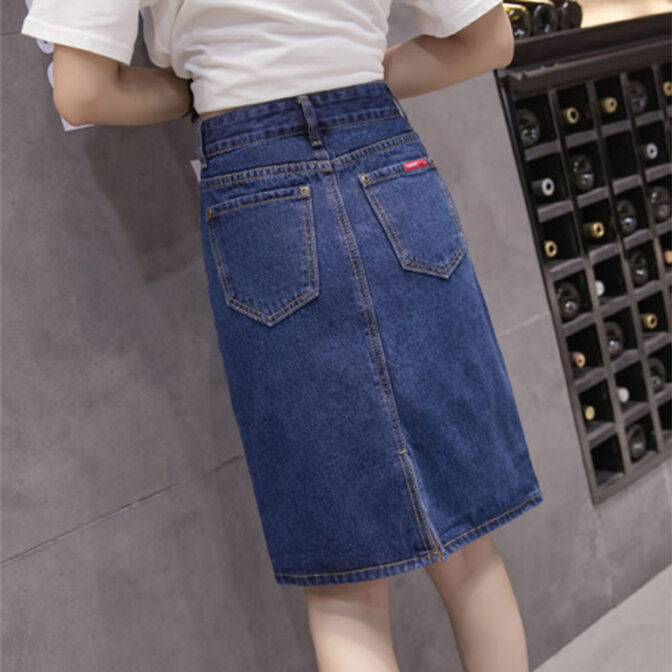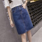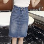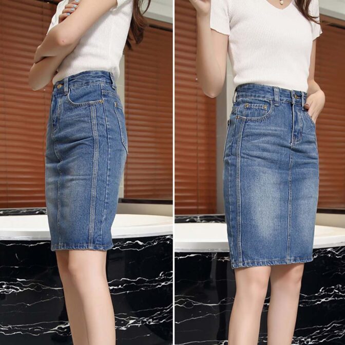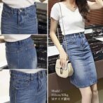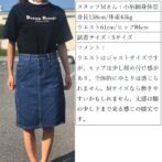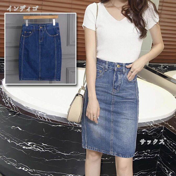 引き締め感のあるタイトデザインで小尻&美脚効果が抜群の膝丈デニムスカート。