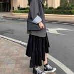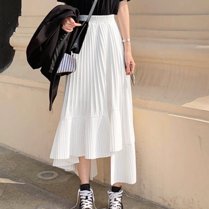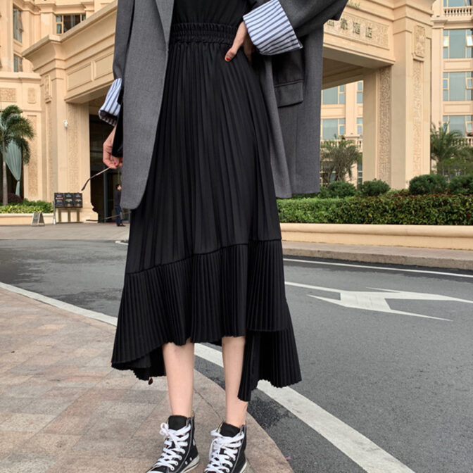 プリーツの切り替えデザインでふんわり感と落ち感の絶妙バランスのロングスカート。