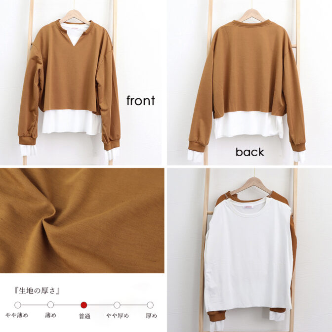 ネックと裾がフェイクになっていて、着るだけでレイヤードしているかのようなワンランク上のコーディネートが出来上がります。